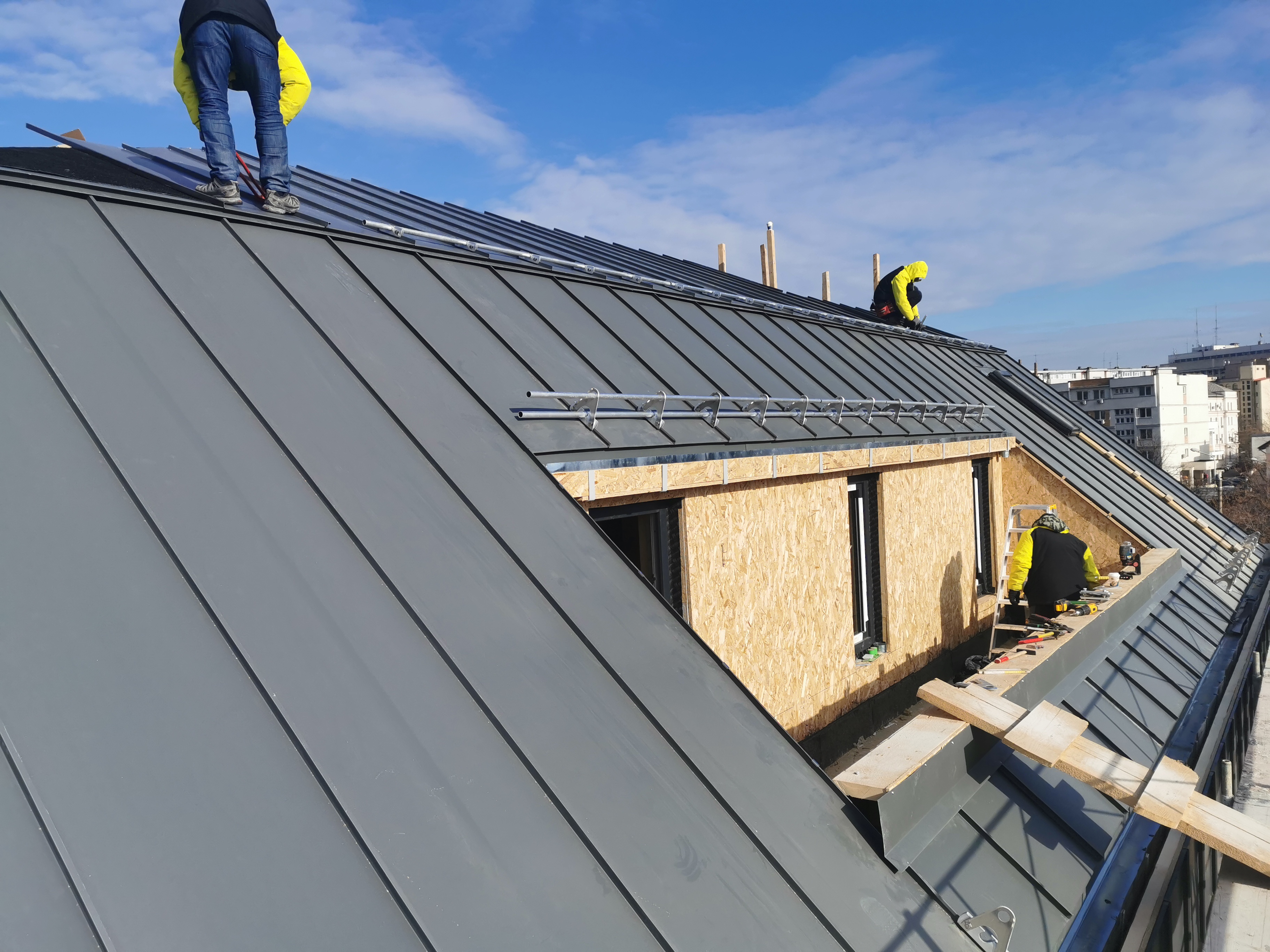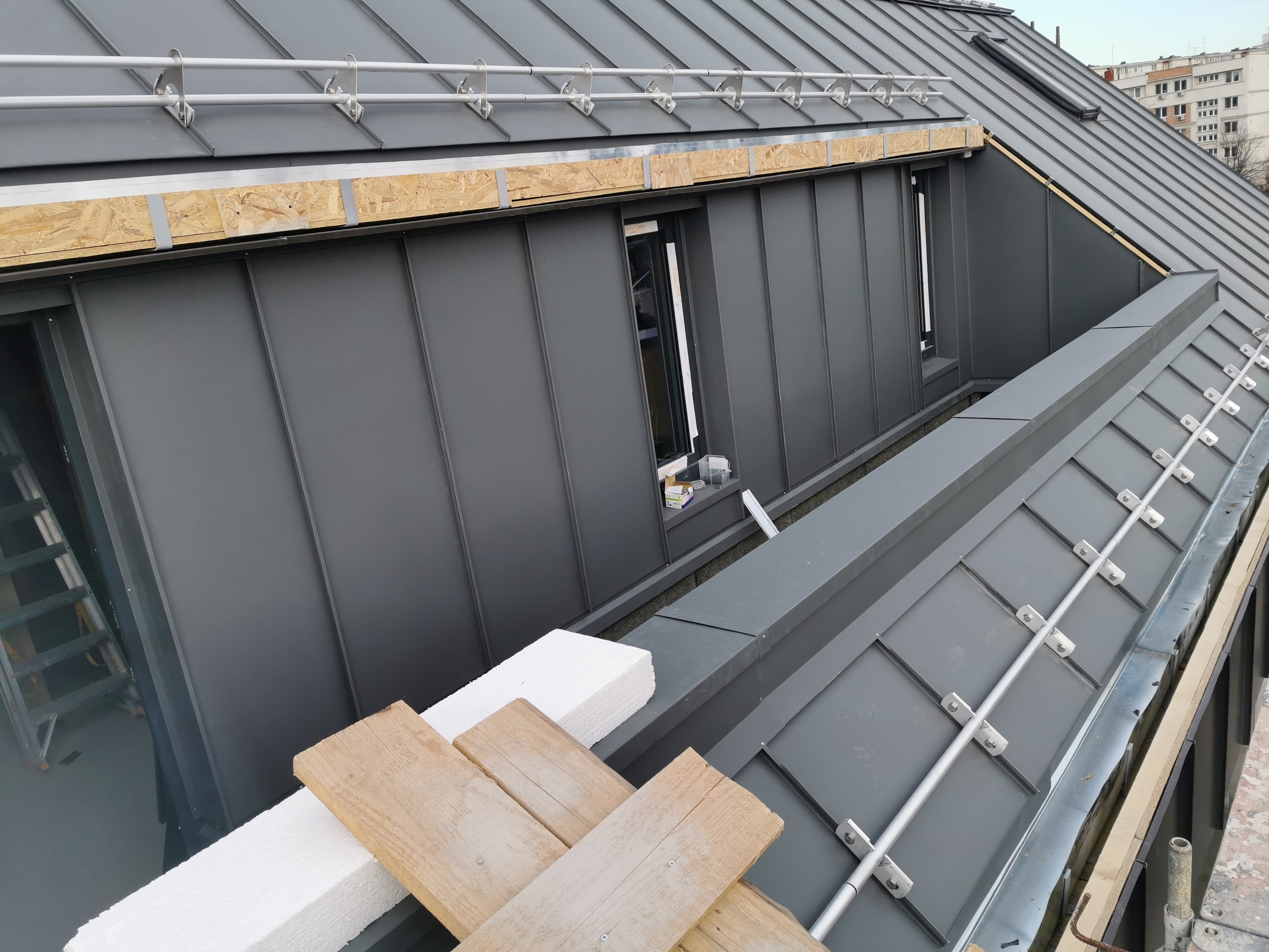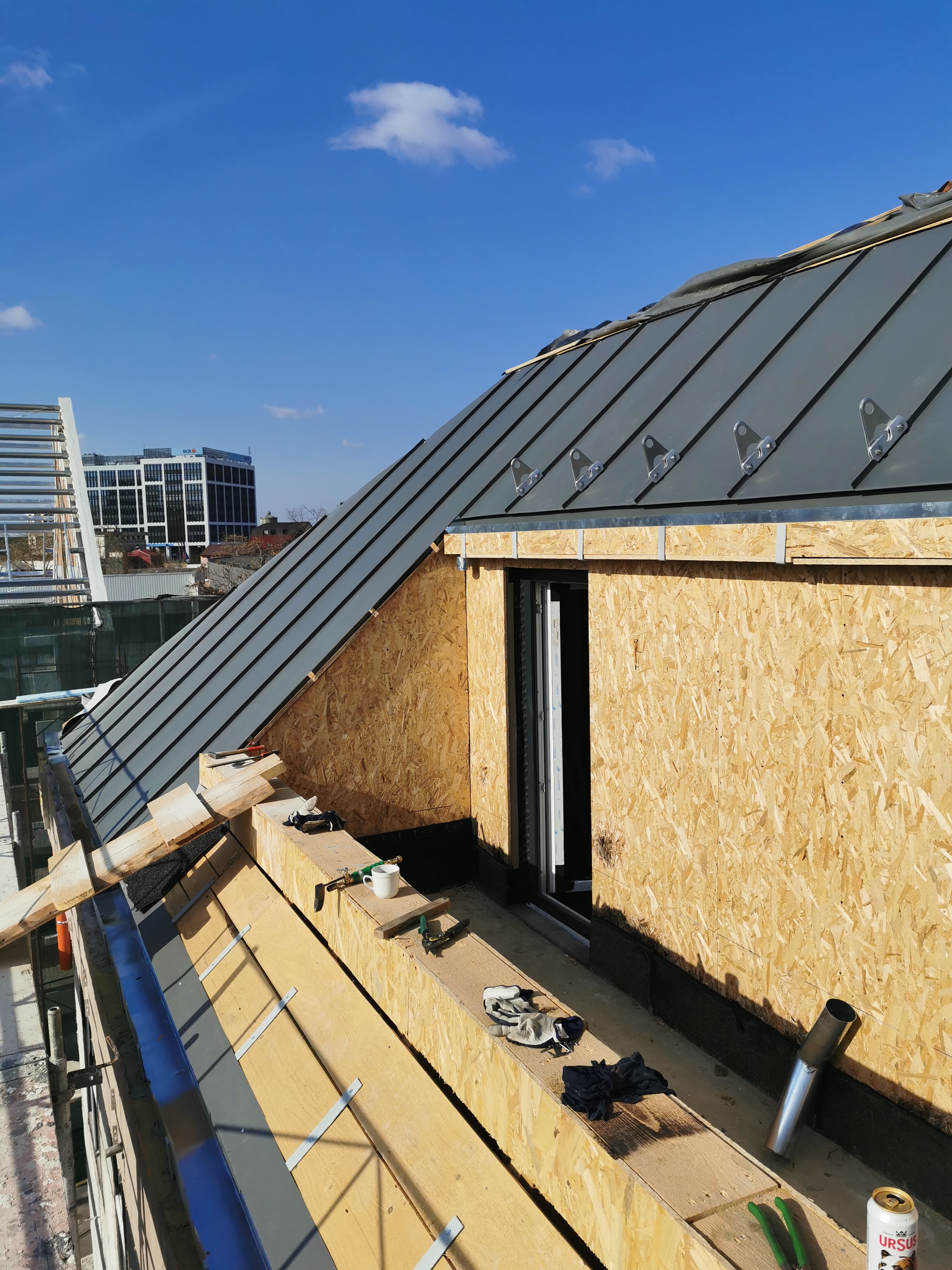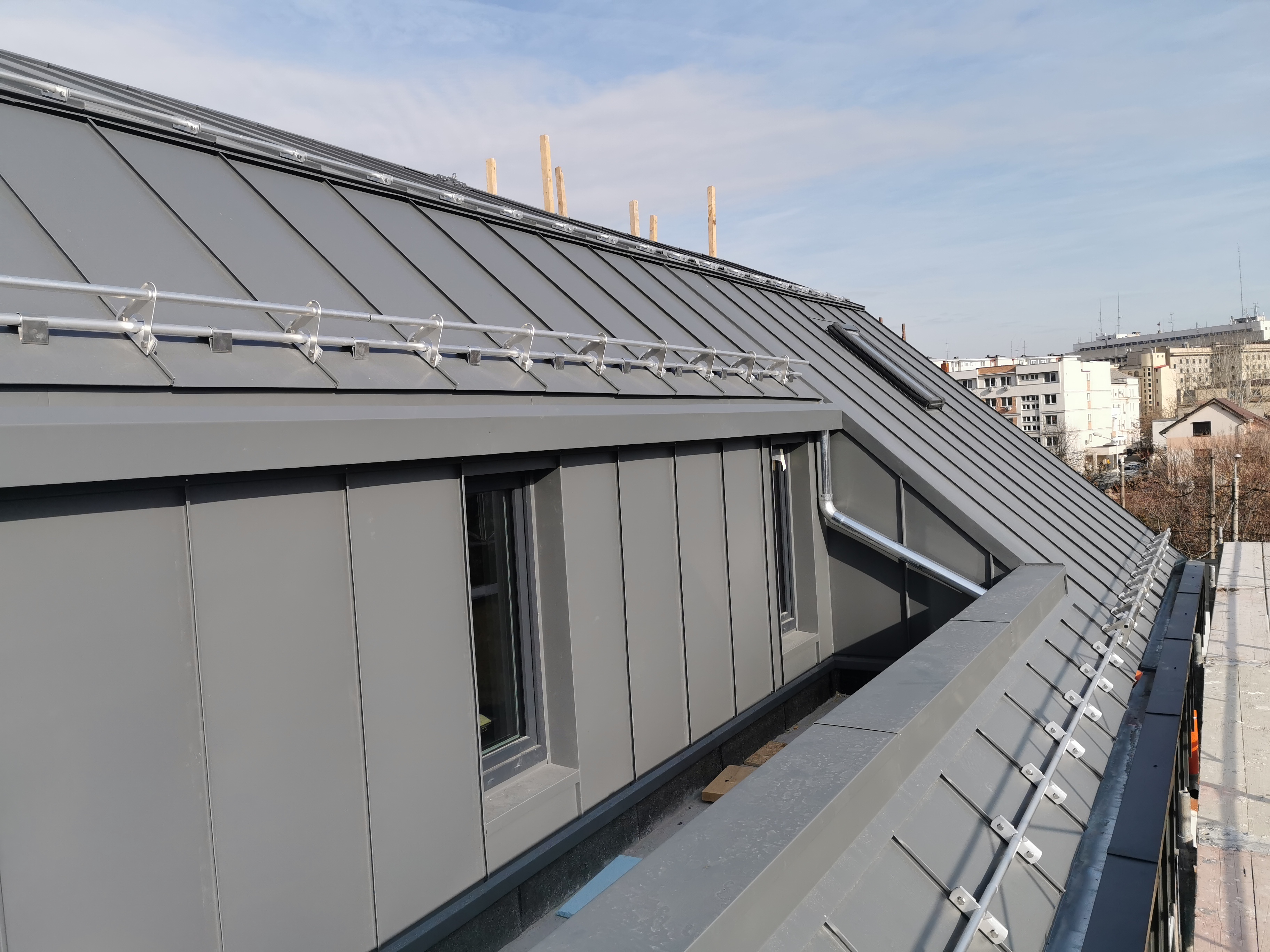 Descriere: Acoperis + Jgheab mascat Titan zinc + mansardă Materiale: Aluminiu vestis 0.7mm Ral: Agatha